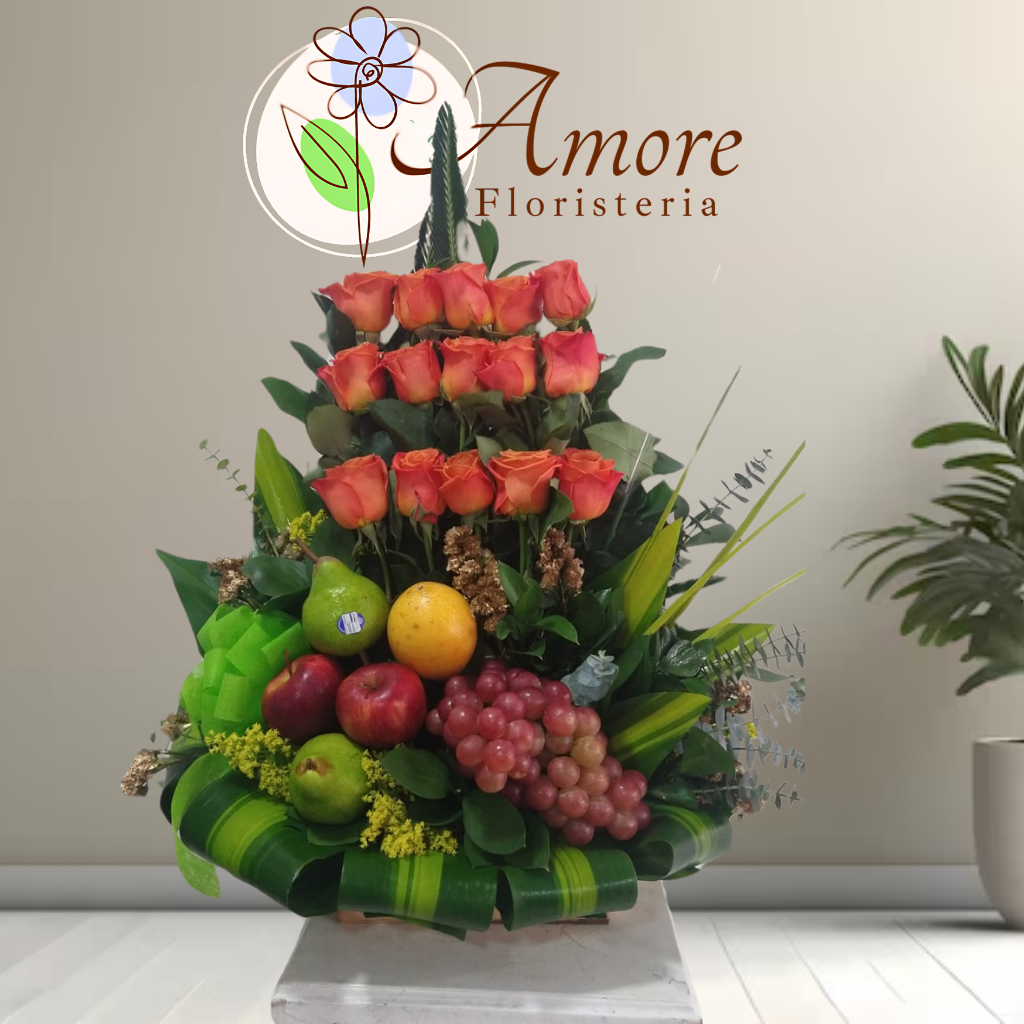 Este arreglo es ideal para celebrar logros y momentos importantes con un detalle abundante y llamativo. Su diseño vertical y la combinación de flores y frutas lo convierten en una excelente opción para transmitir prosperidad, reconocimiento y buenos deseos de manera elegante.