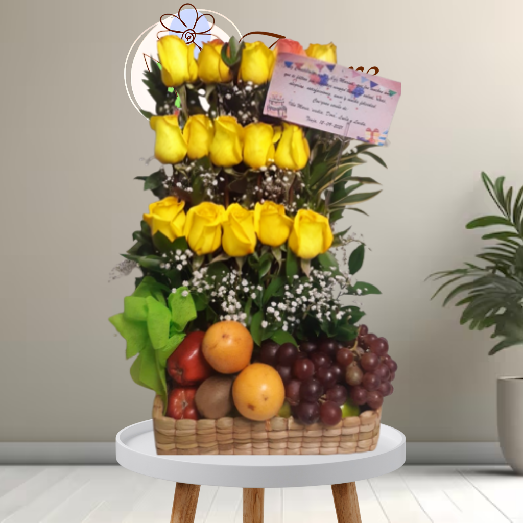 Arreglo generoso que combina flores y frutas, ideal para expresar agradecimiento, reconocimiento o buenos deseos en momentos especiales. Funciona muy bien como regalo institucional o familiar.